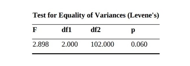 Levene’s test for equality of variances examined the assumption of homogeneity in the data for the analysis of variance (ANOVA). The test produced an F statistic of 2.898, with degrees of freedom for the numerator (df1) equal to 2.000 and degrees of freedom for the denominator (df2) equal to 102.000. The p-value was 0.060. The p-value of 0.060 suggests no evidence to reject the assumption of homogeneity. Therefore, Levene’s test indicates that the assumption of homogeneity is not violated, allowing for the appropriate use of the “none” version of ANOVA for data analysis.